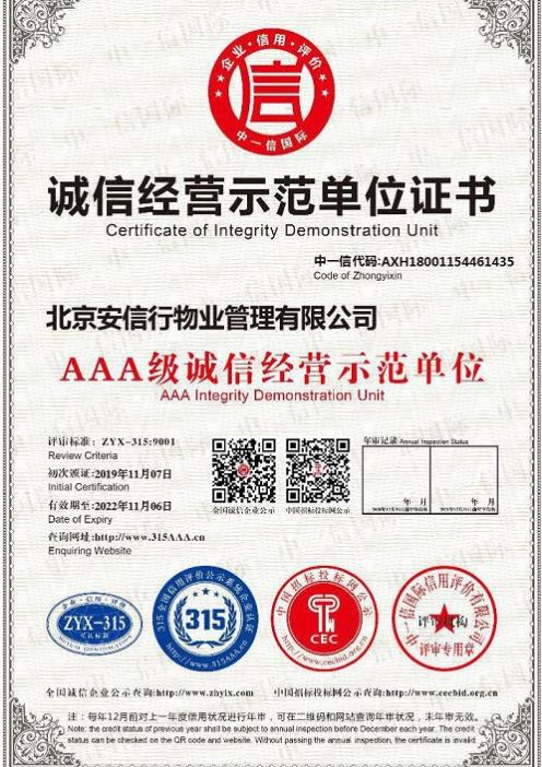 北京安信行物業(yè)管理有限公司(以下簡稱:安信行)成立于2000年,是一家在國內(nèi)物業(yè)管理行業(yè)中具有實力和成功管理經(jīng)驗的物業(yè)服務(wù)商。安信行自成立以來,銳意進(jìn)取,不斷挑戰(zhàn),憑借雄厚的企業(yè)實力、高素質(zhì)的管理人才、全新的經(jīng)營理念、豐富的行業(yè)經(jīng)驗、先進(jìn)的服務(wù)模式,已樹立起優(yōu)良的物業(yè)管理形象,在不同類型的物業(yè)及設(shè)施運作方面,為客戶提供著高標(biāo)準(zhǔn)、高質(zhì)量的物業(yè)管理服務(wù)。